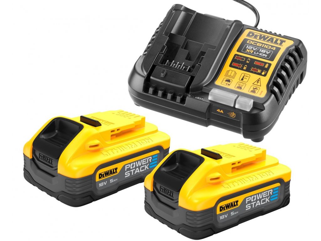- Sada dvou akumulátorů POWERSTACK 18V 5,0 Ah a nabíječky DeWALT DCB1104.