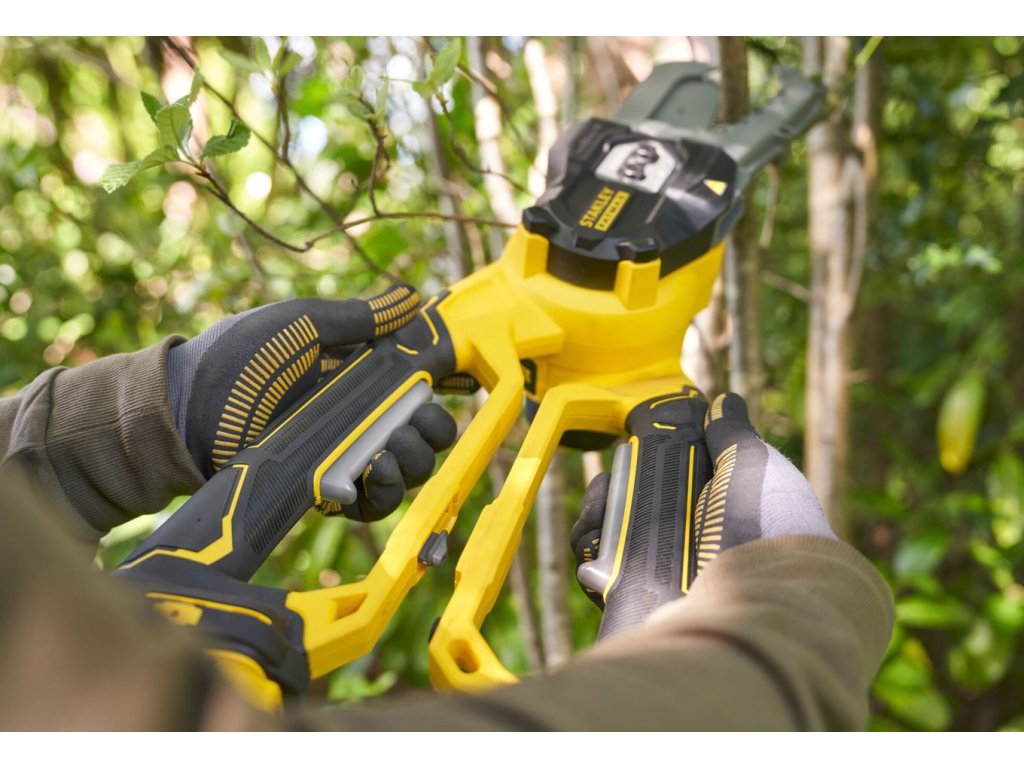 - Rukojeti s dvojitým spínačem ve stylu nůžek na větve - přístroj lze spustit pouze oběma rukama, což zajišťuje bezpečnost a snadné používání