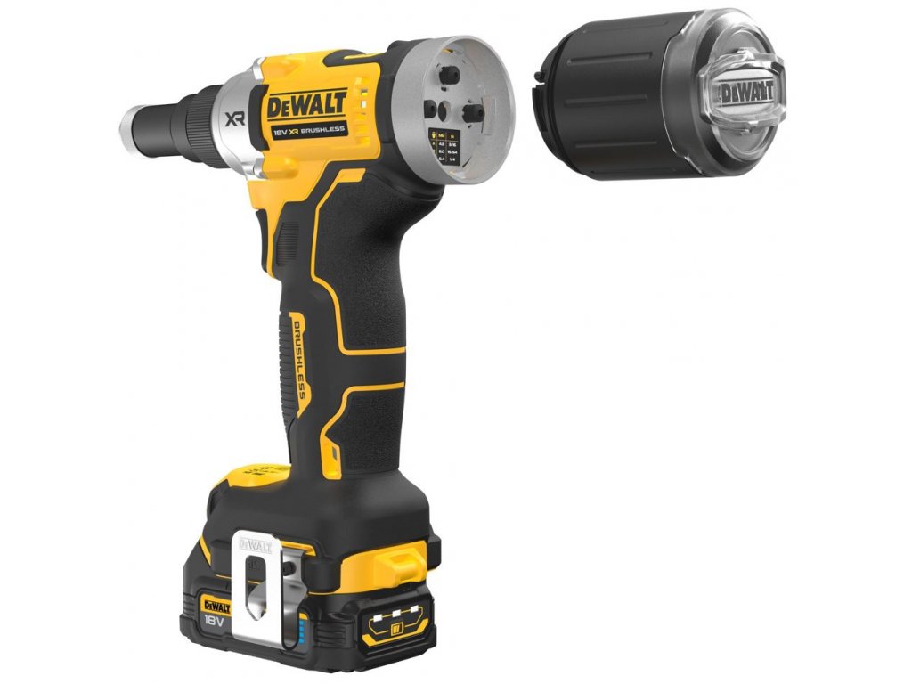 - Výměna trysky je u těchto kleští hračkou. Bez námahy a bez potřeby nástrojů můžete trysku vyměnit v průběhu několika sekund. S Aku nýtovacími kleštěmi DEWALT DCF414 se nýtování stává rychlou a jednoduchou prací.