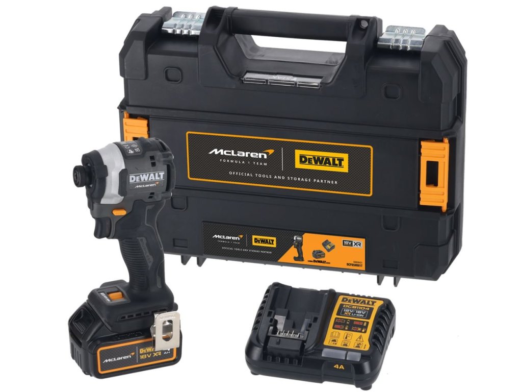 DCF85MM1T DEWALT MCLAREN 18V AKU BEZUHLÍKOVÝ RÁZOVÝ UTAHOVÁK 1/4", 1 X 4,0 AH, NABÍJEČKA, KUFR T-STAK