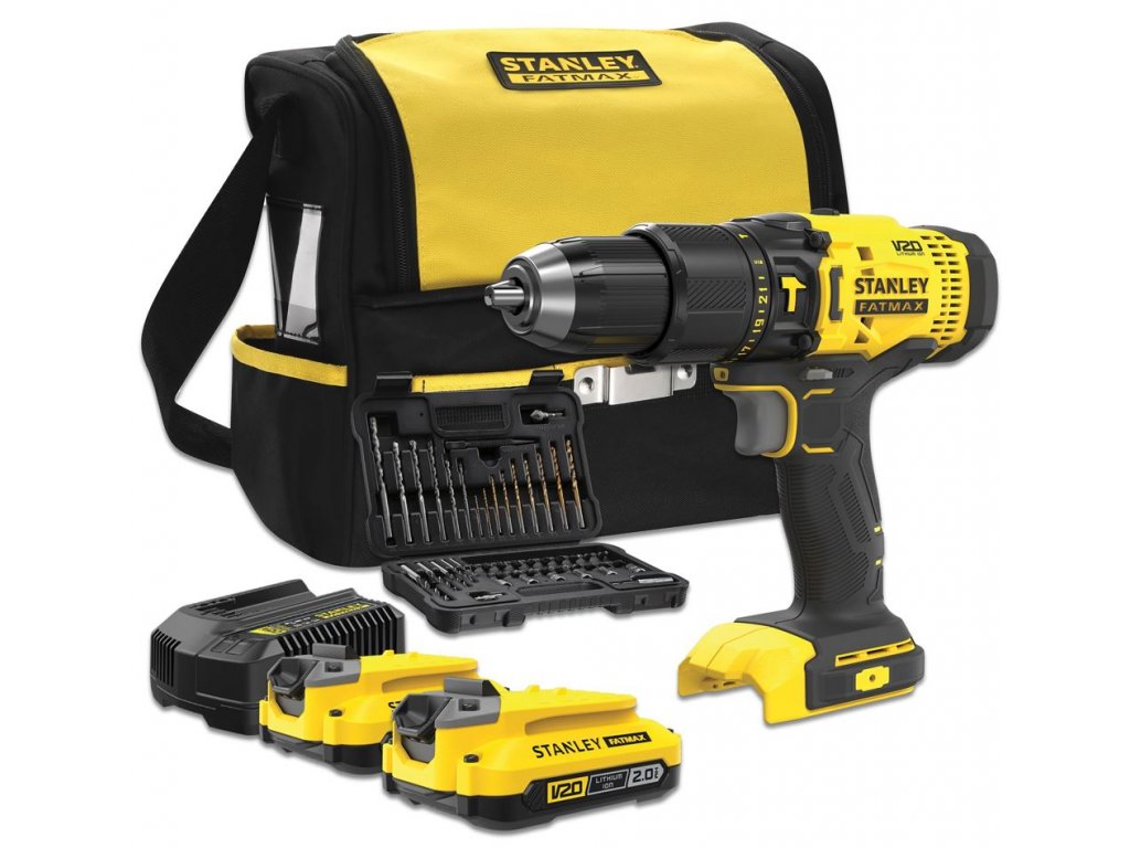 SFMCD711DSA 18 V AKU STANLEY FATMAX V20 DVOURYCHLOSTNÍ PŘÍKLEPOVÁ VRTAČKA, 2 X 2,0 AH BATERIE, NABÍJEČKA, BRAŠNA, 50 KS PŘÍSLUŠENSTVÍ