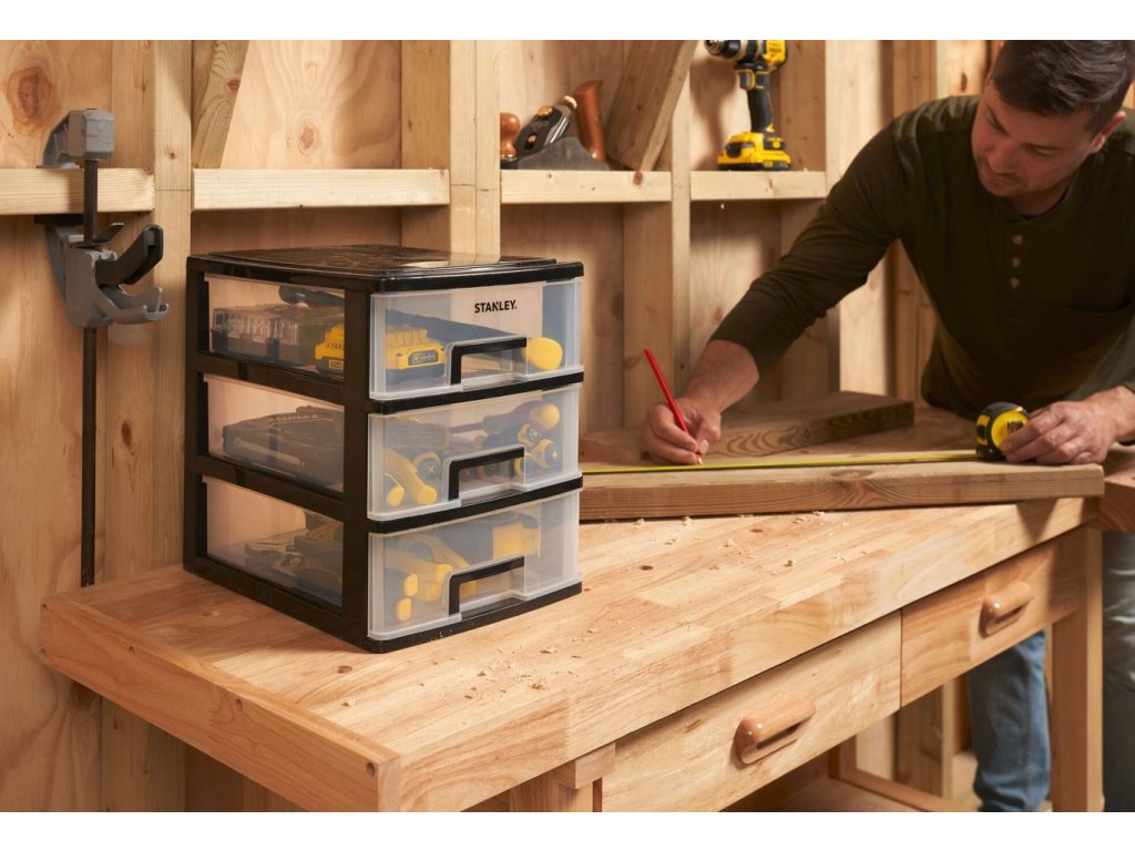 - POHODLNÉ SKLADOVÁNÍ: STANLEY® Velký úložný box se třemi zásuvkami: udržujte pořádek v drobných dílech, upevňovacích prvcích a příslušenství.