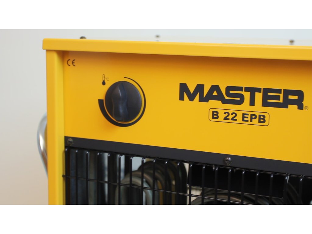 Nejvýkonnější elektrické topidlo s ventilátorem Master B22 EPB, vhodné i pro vytápění velkých prostor až do cca 150 m2. Elektrický přímotop s ventilátorem Master B22 EPB je oblíbený v lakovnách, pneuservisech, skladech i výrobních halách. Přímotop Master B22 EPB je určen pro připojení ke zdroji třífázového proudu, na topidle je zásuvka s pětikolíkem 400 V / 32 A. Master B3,3 EPB má vestavěný pokojový termostat, který sepne topidlo při poklesu teploty pod nastavenou hodnotu. Topidla Master řady EPB jsou na rozdíl od řady ECA vybavena dochlazením topné spirály - i po vypnutí přímotopu zůstává zapnutý ventilátor dokud topné spirály nevychladnou.